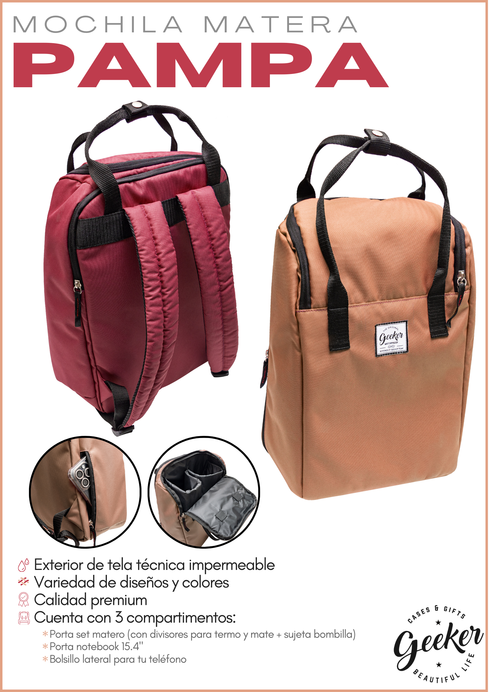 - Compartimento porta set matero (con divisores para termo y mate + sujeta bombilla)